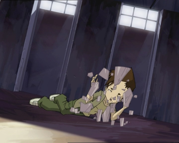 In the middle of those evolutions, Ulrich's role remains simple: he is, after all, a henchman. Of course, his life is not the most quiet one; but be it falling off the roof of Kadic, being disintegrated in the global Network or being hit in the face by a meteorite, the risk and the results are roughly the same. So Ulrich fights for his life and for his friends, on Earth and on Lyoko, alone or in a group. His relationship with Yumi being stuck at a standstill and his daily rivalry with William being gone, some kind of a slight routine sets in, sometimes broken by Odd's stabs in the back (episode 92 “Cold Sweat”) or unexpected attacks by XANA. Ulrich tries not to let himself go, by physically training with Jim (episode 74 “I'd Rather Not Talk About It”) or learning the mysteries of computer stuff (episode 72 “Crash Course”).